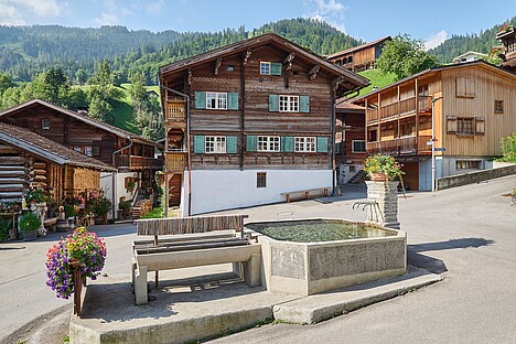 Dicht gedrängt stehen die alten Walserhäuser um den zentralen Dorfbrunnen von Jenaz. So auch das sonnenverbrannte und mit Haussprüchen geschmückte "Haus am Platz", in dem ab April 2021 bis zu sechs Feriengäste der schweizer Stiftung Ferien im Baudenkmal Prättigauer Baukultur erleben können.
